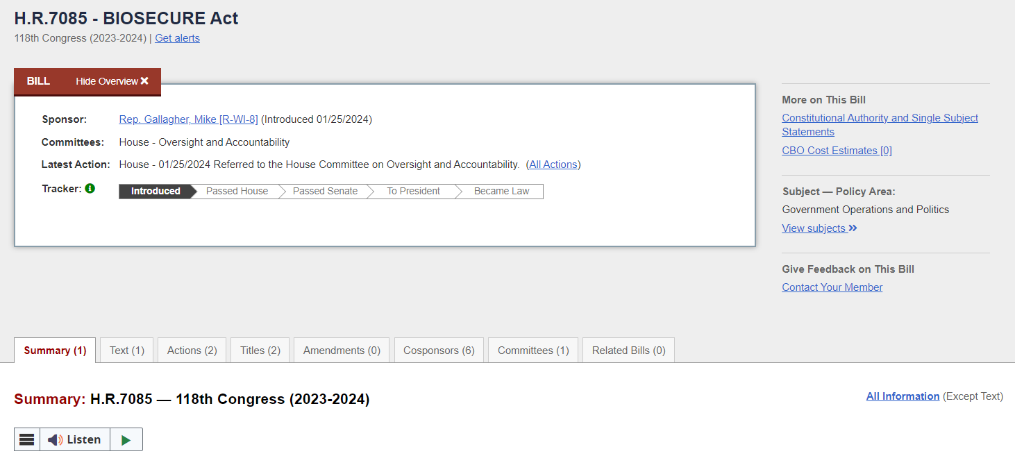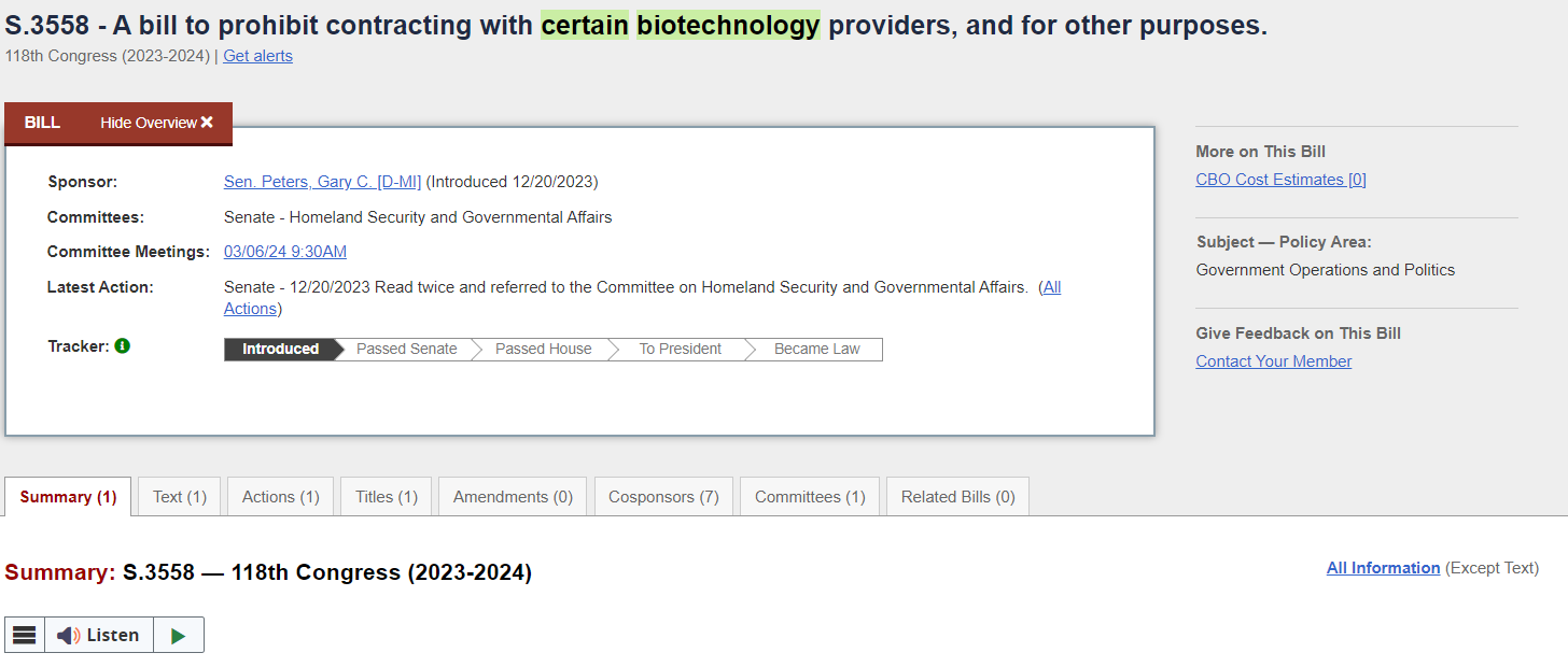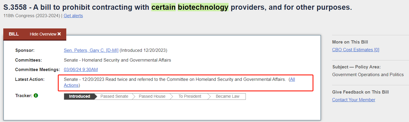 如药明康德提到的,目前美国国会方面有两份关注度较高的《生物安全法案》草案,分别为众议员Mike Gallagher在1月25日提交的编号为H.R.7085的版本,另一份为参议员Gary Peters在2023年12月提交的编号为S.3558的版本。