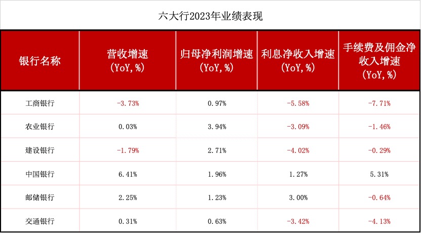 从业绩表现来看,除工商银行(601398.SH)和建设银行(601939.SH)出现“增利不增收”情况外,其余四家均录得营收净利双增。其中,中国银行(601988.SH)2023年营收同比增长6.41%,排在六大行首位;归母净利润增速最快的是农业银行(601288.SH),同比增长了3.94%。