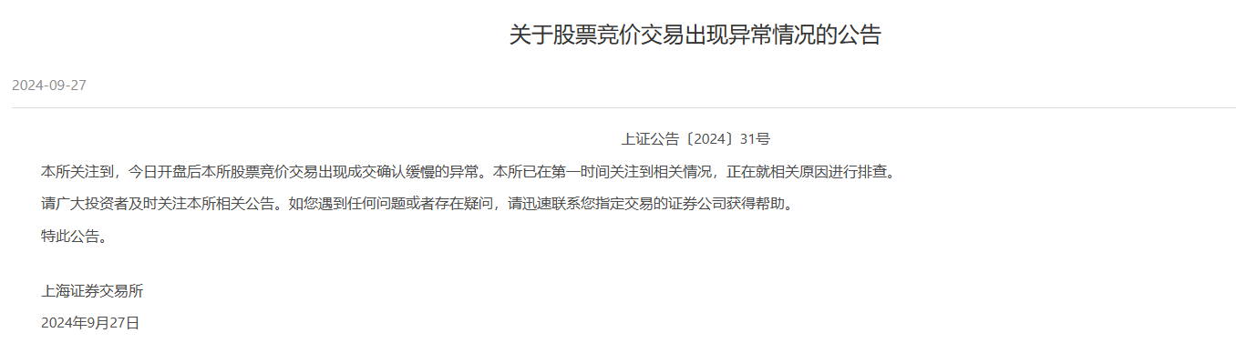 对此,上交所公告称,今日开盘后本所股票竟价交易出现成交确认缓慢的异常。本所已在第一时间关注到相关情况,正在就相关原因进行排查,请广大投资者及时关注本所相关公告。如您遇到任何问题或者存在疑问,请迅速联系您指定交易的证券公司获得帮助。