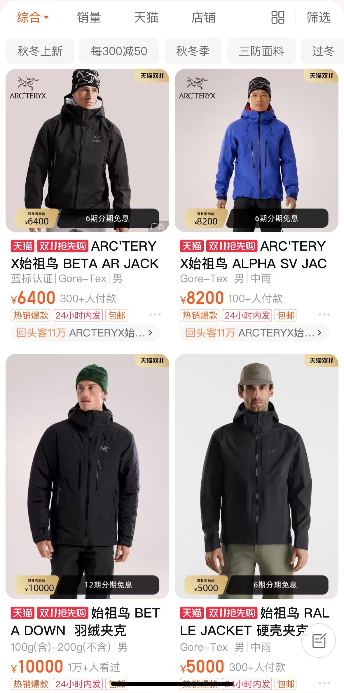 “从面料和工艺来看,三四百和五六百的冲锋衣差距不大,更多的是看品牌价值和消费者的体验感。”郑源森解释道,“但是千元以上的高端产品就会有一定的技术和功能优势,一些国际知名品牌从辅料、五金开始已经选择大牌出品,防水、透气、保暖等功能方面也会用一些有创新科技的面料,比如用透气性更好的PTEE薄膜,成本差价也不小。兼具功能性和实用性又叠加品牌效应,就算卖几千块(元),一些追求差异化的消费者也是愿意买的。”高端产品拥有不少忠实客户,但能使得户外服饰品类蓬勃发展、快速扩容的基本盘依旧是大众消费市场,银柿财经发现,目前电商平台上预售情况较好的正是500元至600元价格带的“三合一”冲锋衣新品,该品类的领跑之势依旧抢眼。