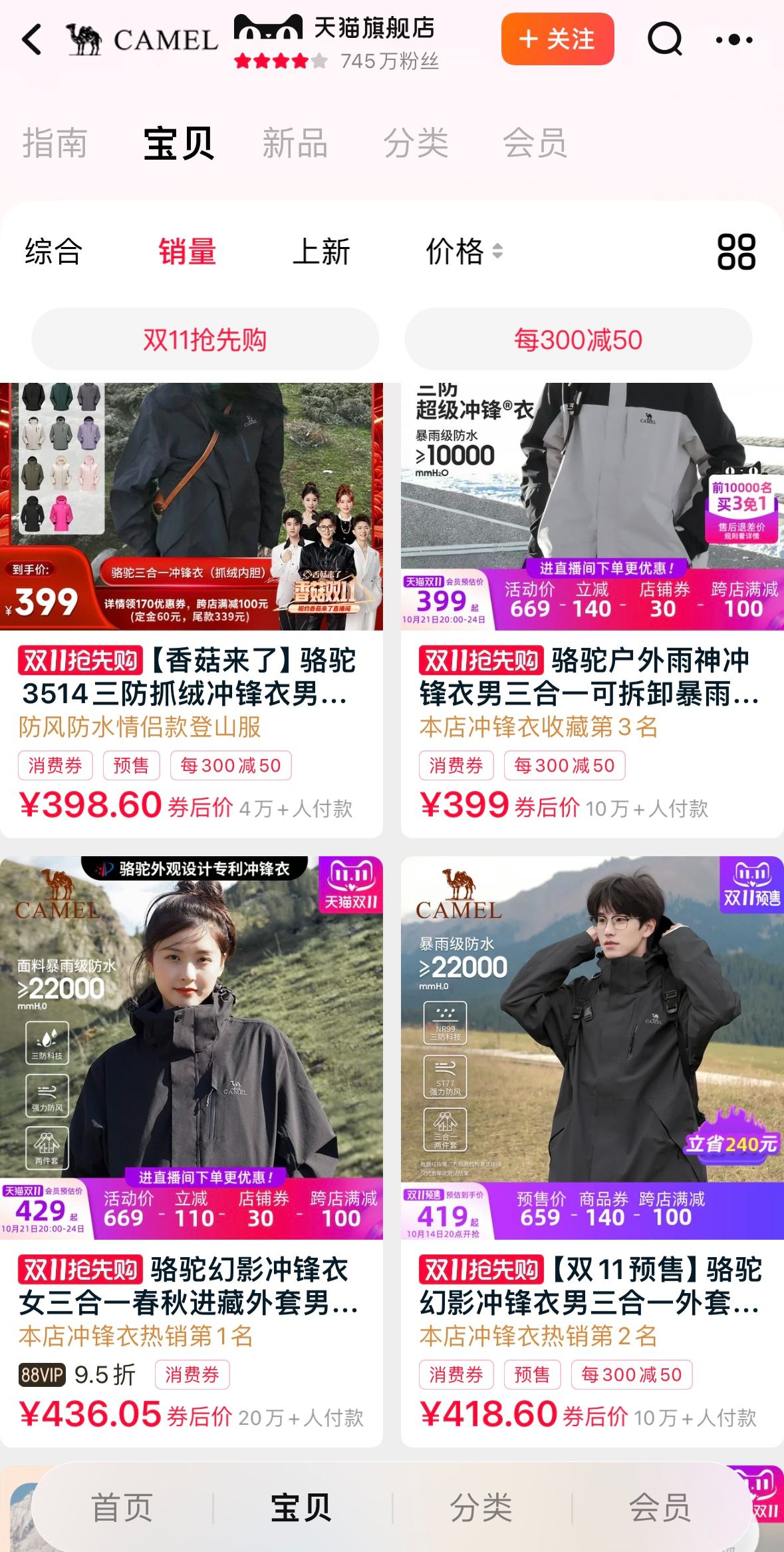 10月14日,天猫、京东等电商平台正式启动2024年“双11”大促,无论是预售还是现货,目前“三合一”冲锋衣都稳居服饰品类销售排行榜前列,再度打败风衣、夹克、羽绒服等品类,成为今秋消费者的首选,其中,骆驼、伯希和、拓路者等品牌隐隐已有“爆品”预定之势。