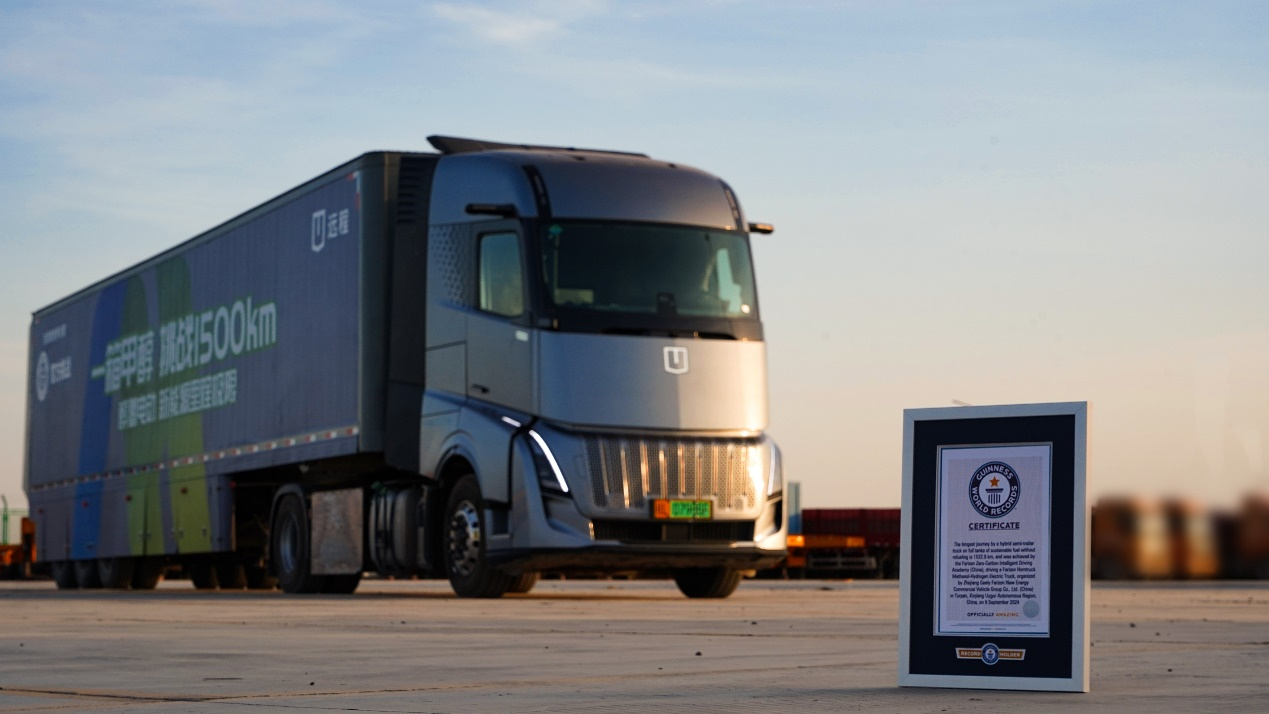 值得一提的是,10月17日,远程旗下新能源重卡旗舰车型——远程星瀚H醇氢电动牵引车成功挑战吉尼斯世界纪录TM称号。从甘肃武威到新疆吐鲁番,该车型仅靠一箱绿色甲醇穿越河西走廊,在整车满载42吨的情况下,行驶里程达到1522.9公里。