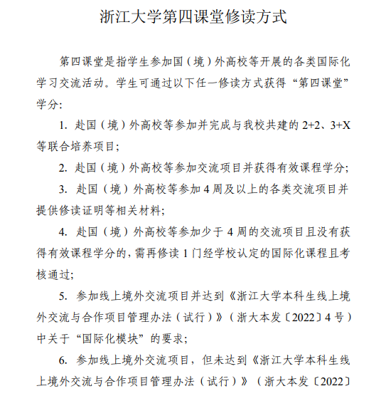 银柿财经注意到,就在今年1月,浙江大学印发《浙江大学本科生第二、三、四课堂学分管理办法》,其中在“第四课堂修读方式”部分写明,学生可通过“赴国(境)外高校等参加并完成与我校共建的2+2、3+X等联合培养项目”“赴国(境)外高校等参加交流项目并获得有效课程学分”“赴国(境)外高校等参加4周及以上的各类交流项目并提供修读证明等相关材料”等方式获得“第四课堂”学分。