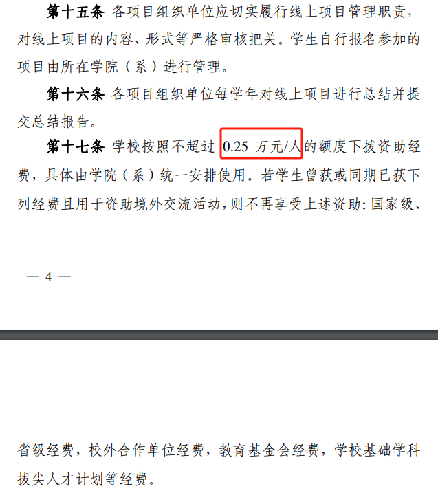 以2024年10月30日官网发布的“英国剑桥大学金融科技与科学技术2024-2025寒假课程项目”为例,该课程是“在线交流”模式,项目费用为9800元人民币。尽管在具体信息中写明“该项目将申请本科生海外交流专项经费资助,经济学院的本科生还可以再申请学院1500元的补助”。不过,根据银柿财经查询到的《浙江大学本科生线上境外交流与合作项目管理办法(试行)》第十七条,“学校按照不超过 0.25 万元/人的额度下拨资助经费,具体由学院(系)统一安排使用”。也就是说,仍有至少5800元需自费。