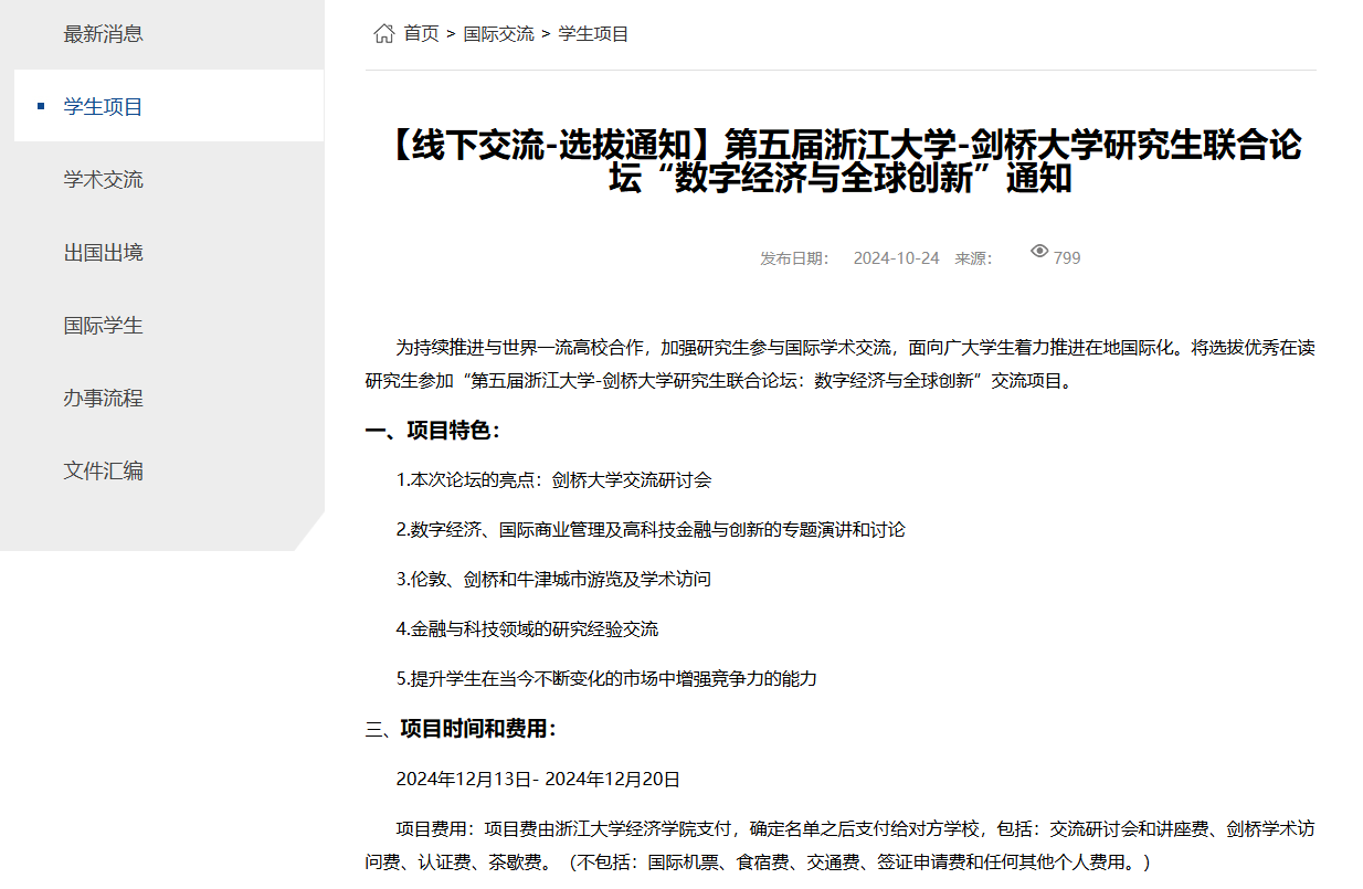 根据10月24日学院官网“学生项目”一栏发布的“线下交流—选拔通知”,“为持续推进与世界一流高校合作,加强研究生参与国际学术交流,面向广大学生着力推进在地国际化,将选拔优秀在读研究生参加‘第五届浙江大学—剑桥大学研究生联合论坛:数字经济与全球创新’交流项目”。