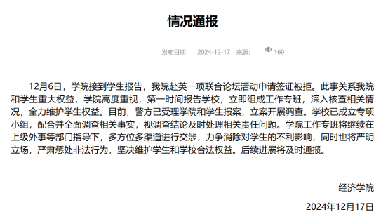 17日下午,浙江大学经济学院在校内网发布情况通报,称针对“赴英一项联合论坛活动申请签证被拒”,目前,学院已第一时间报告学校,立即组成工作专班,深入核查相关情况。警方已受理学院和学生报案,立案开展调查。学校已成立专项小组,配合并全面调查相关事实,视调查结论及时处理相关责任问题。
