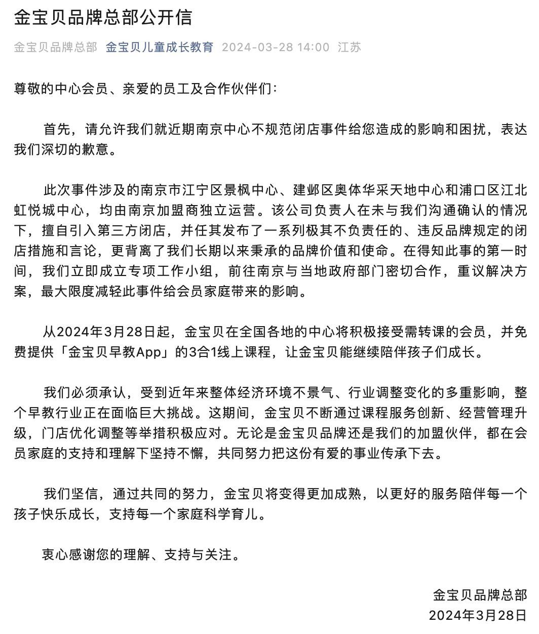 无独有偶,自2022年起,金宝贝也频频传出将大规模闭店的消息,此后部分门店关闭,部分门店进行了调整和会员整合。2024年,又有多家金宝贝门店突然停业,深陷闭店潮、退费难等舆论风波。有停业门店在《致家长信》中表示,历经“双减”时代、疫情时代和后疫情时期,复杂多变的市场经济环境加快了门店现金流的损耗,打击了客户的消费信心,导致校区经营举步维艰,尽管运营方试图以融资等形式缓解现金流断裂危机,但因市场低迷,最终被迫暂停运营。