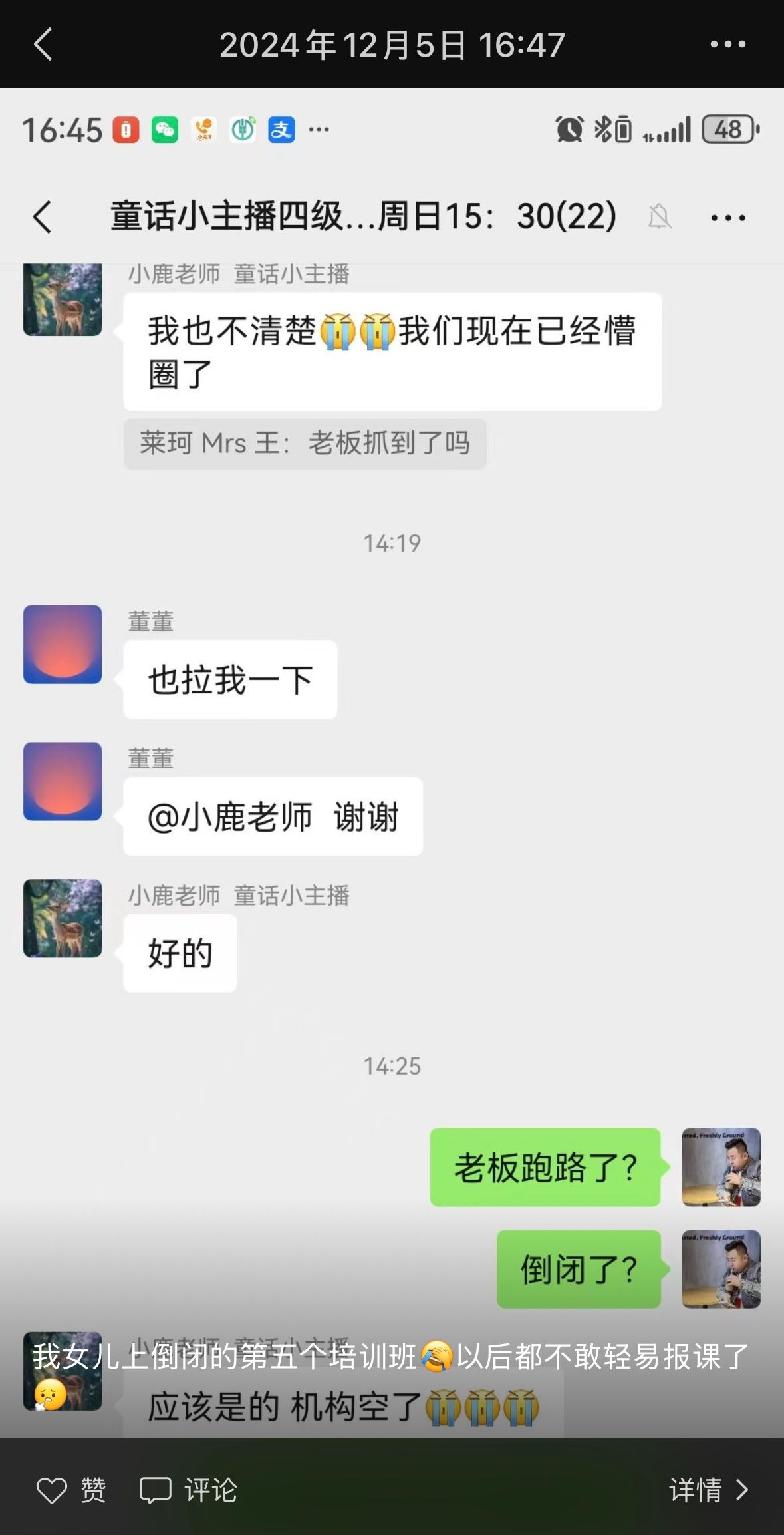 在2024年临近收官之时,董一锋“又双叒”收到了“机构停课、老板跑路”的糟心消息,随后他在朋友圈发了一张课程交流群聊截图并配文道:“我女儿上倒闭的第五个培训班,以后都不敢轻易报课了。”