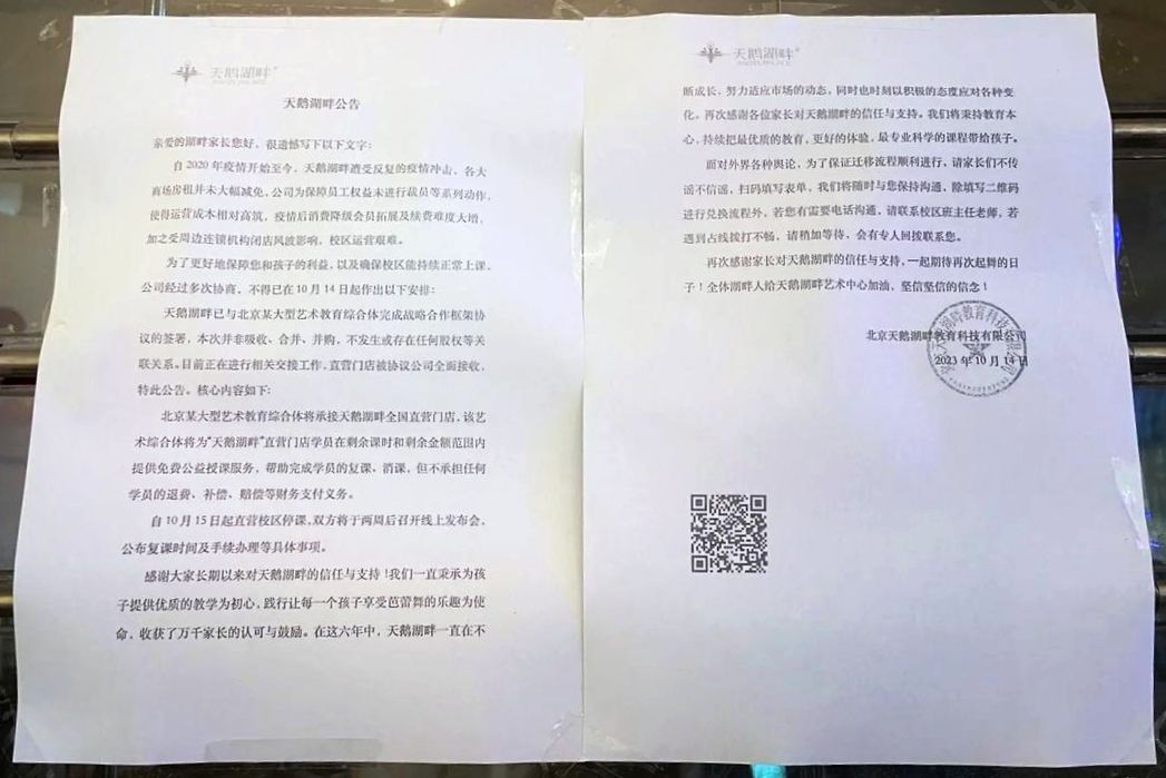 “天鹅湖畔”让董一锋真正见识到了“昨天报班、今天倒闭”的荒唐事。“礼拜四交了钱,礼拜六就收到通知说‘倒闭了’,一天课也没上过。还好这家‘天鹅湖畔’倒得太快,我刚付的课时费还没来得及转到机构账上。当时商场财务刚好在休假,还没处理这笔转款,后来商场主动联系我作了退费处理。一共17800元,要是没拿回来,真的损失惨重,但只比我早一天报课的家长,就没那么幸运了。”
