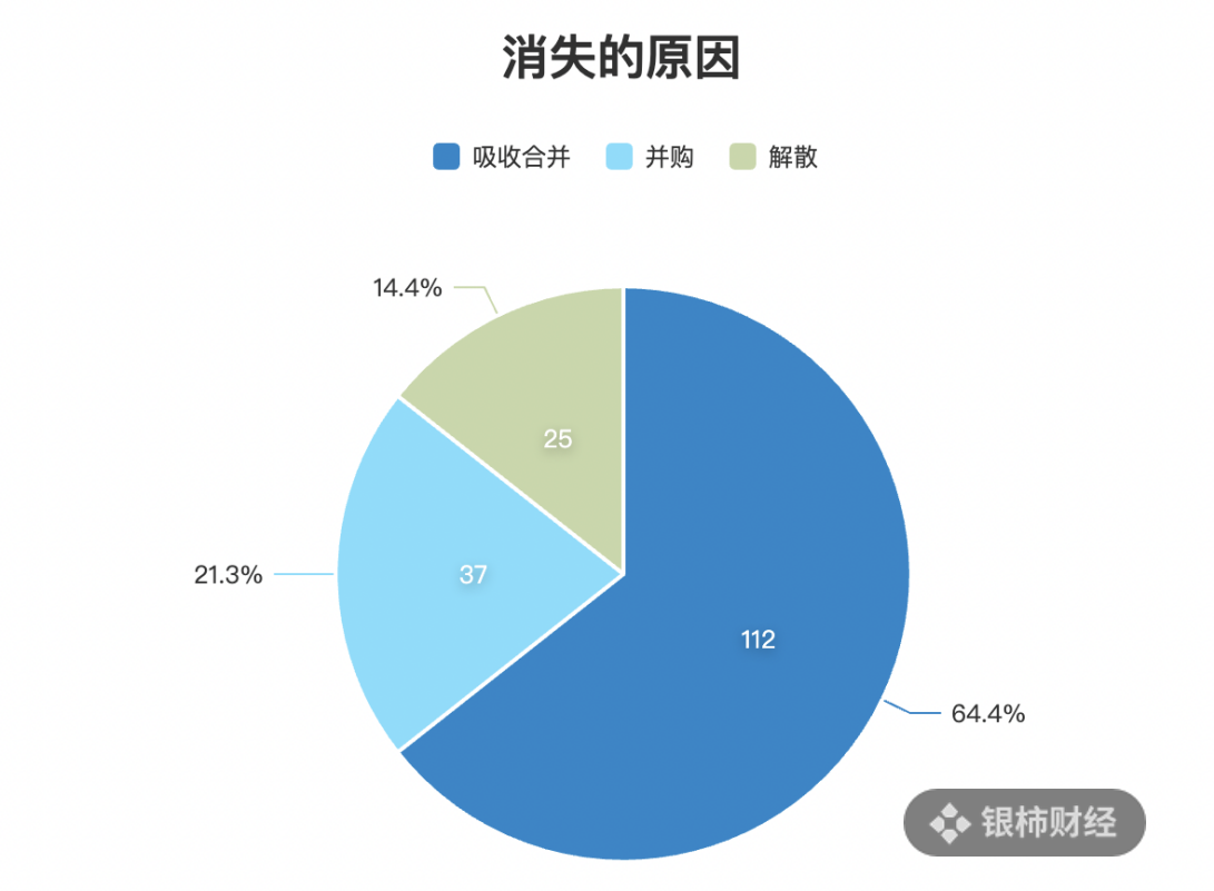 据银柿财经统计,今年注销的银行中,被主发起行吸收合并的有112家,占比为64.4%,被其他行收购的有37家,占比21.3%,还有25家直接解散,占比14.4%。