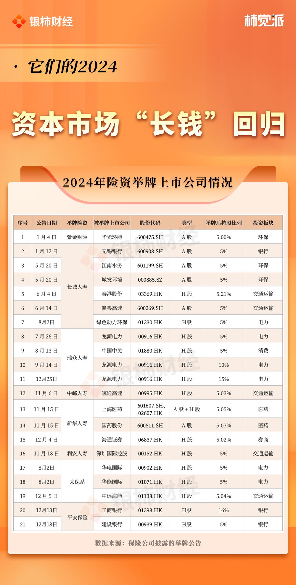 2024年举牌次数最多的险资是长城人寿,共计6次,A股和H股上市公司都有涉及。先后举牌了无锡银行(600908.SH)、城发环境(000885.SZ)、江南水务(601199.SH)、秦港股(03369.HK)、赣粤高速(600269.SH)和绿色动力环保(601330.SH)。