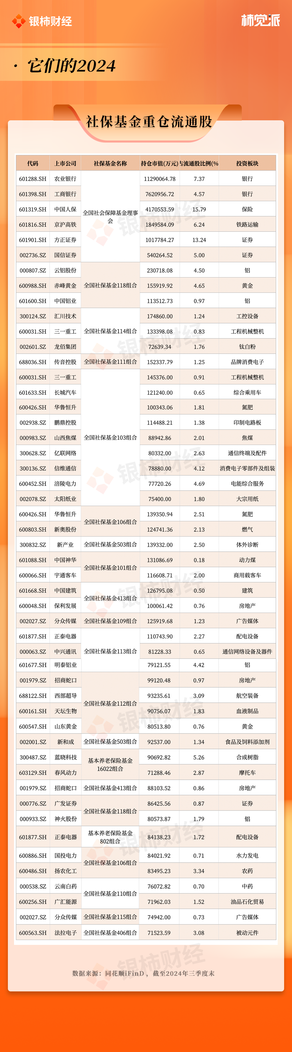 据同花顺iFinD数据显示,截至2024年三季度末,社保基金重仓流通股中,持仓市值超过7亿元的上市公司超过50家,总计市值约3110亿元。同时,社保基金还进入了约100家上市公司的前十大流通股东名单。