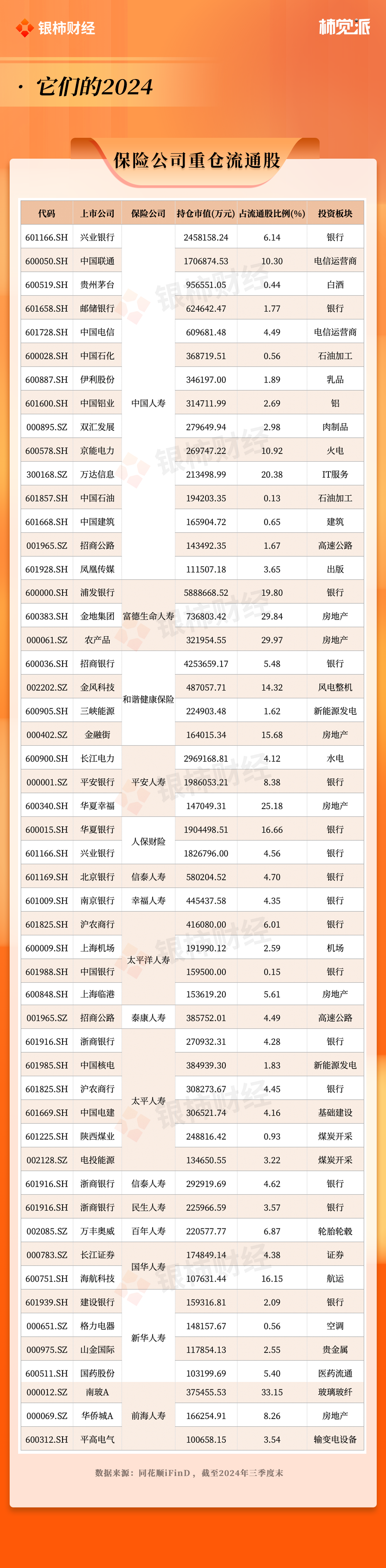据同花顺iFinD数据显示,截至2024年三季度末,包括中国人寿、平安人寿、新华人寿和太平人寿等在内的16家险资公司重仓了多家上市公司,其中持仓市值在10亿元以上的有52家,总计持仓市值达到约3583.4亿元,这些资金起到了稳定资本市场的作用。