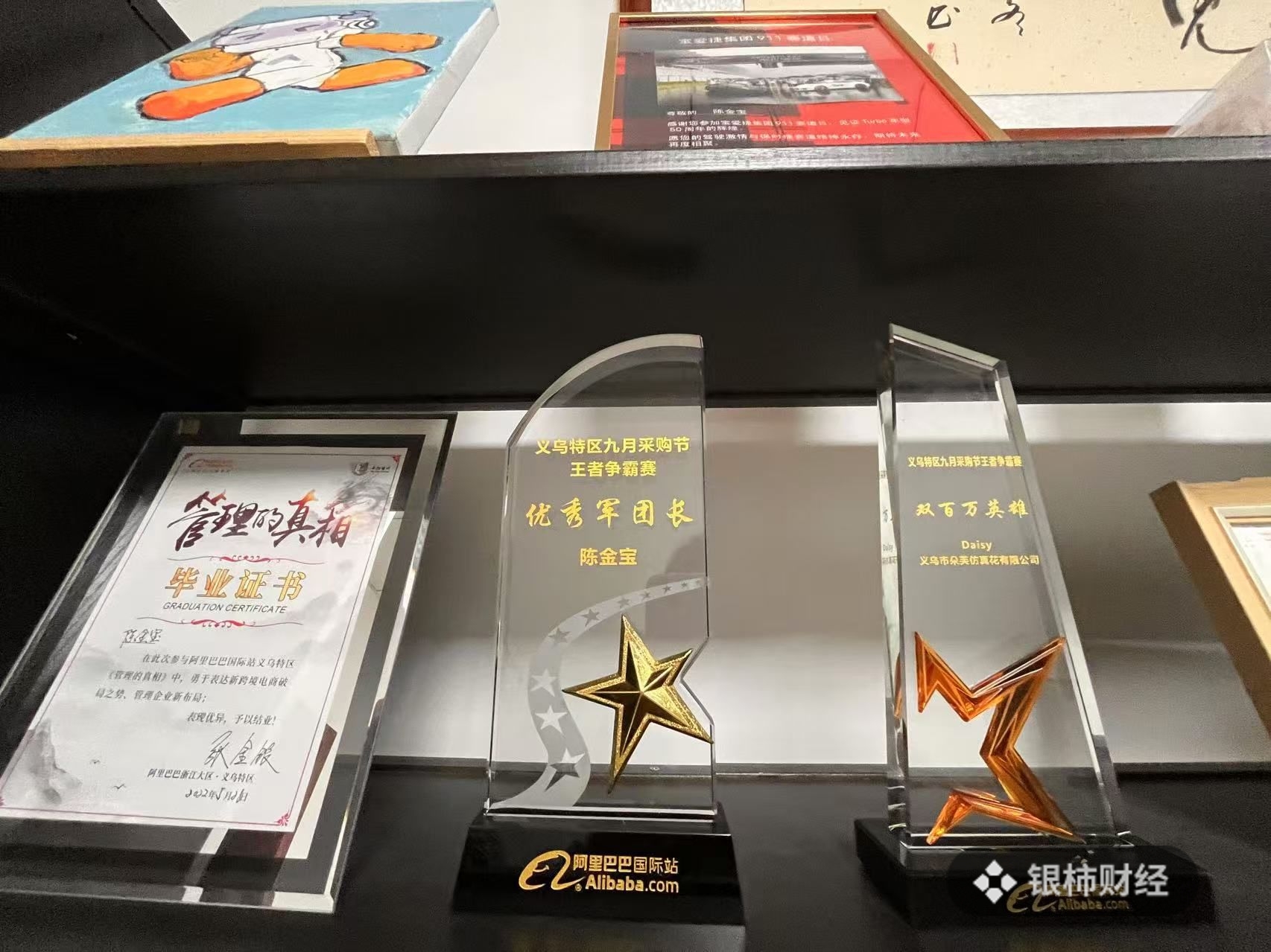 在义乌朵芙的两间办公室,除了产品样品,架子上摆放最显眼的还有大大小小的奖杯。在2024年,陈金宝带领公司团队多次参加了平台在义乌举办的相关比赛,和其他公司一同比拼业绩。9月份义乌朵芙拿下了“五百万企业”荣誉,陈金宝获得了“优秀军团长”称号。