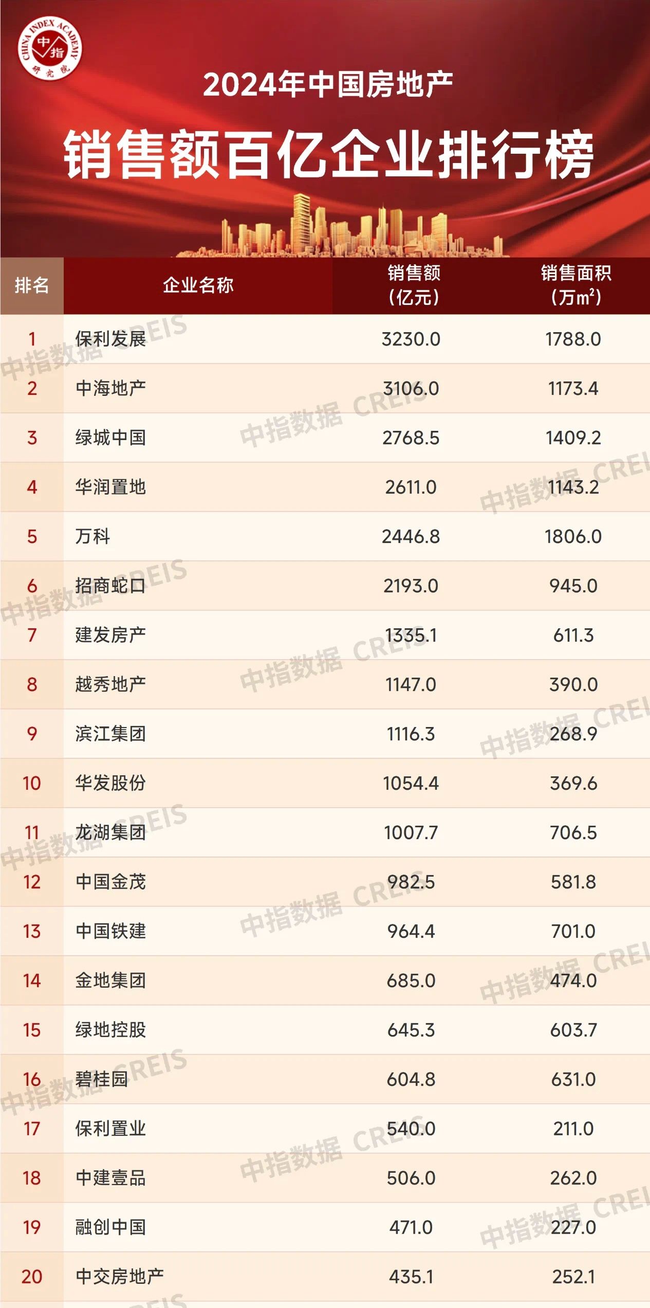 2024年排在销售榜单前三位的房企分别是保利发展(600048.SH)、中海地产(00688.HK)和绿城中国(03900.HK),销售额分别为3230亿元、3106亿元和2768.5亿元。