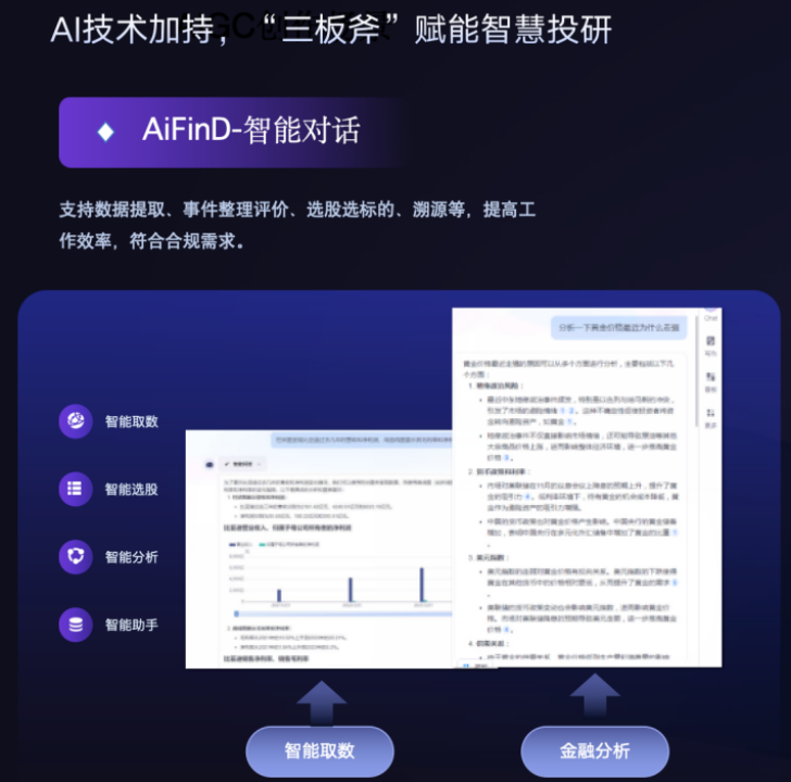 首先在智能对话方面,iFinD支持数据提取、事件整理评价、选股选标的、溯源等,在提高工作效率的同时,也能保证符合合规需求。