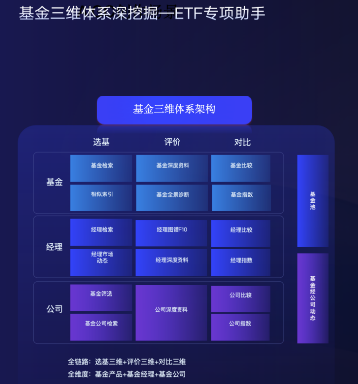 在基金方面,iFinD的数据在所有指标上基本做到全覆盖,同时建立了有同花顺特色的三维基金体系,有选基、评价和对比三项功能。