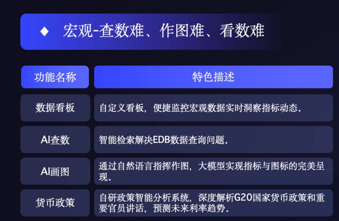 原有的宏观数据量庞大,相应的会面临查数难、作图难、看数难的问题。在新功能下,可以自定义看板,便捷监控宏观数据实时洞察指标动态;通过AI查数,可以智能检索解决EDB数据查询问题;AI画图,能通过自然语言指挥作图,大模型实现指标与图标的良好呈现;货币政策方面,可以实现自研政策智能分析系统,深度解析G20国家货币政策和重要官员讲话,预测未来利率趋势。