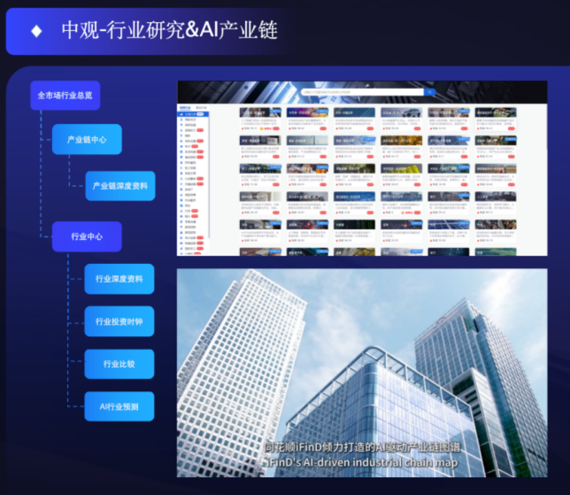 对于中观的行业研究和AI产业链方面,通过iFinD可以不断去挖掘、寻找细分领域的概念行业;在微观方面,通过AI赋能,能解决查数难、复盘难的问题。