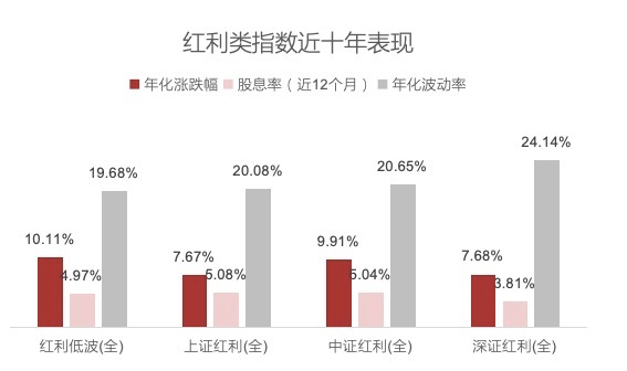在诸多红利策略中,柳军认为,红利加低波是“立于不败而后求胜”的策略。从近十年表现看,与上证红利、中证红利、深证红利等指数相比,红利低波指数波动率相对更低,收益率却表现更好。