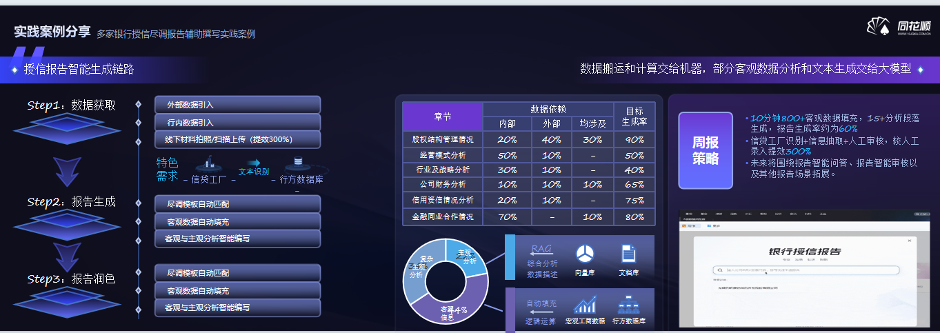 他提到,银行在授信过程中,也需要对公客户经理撰写报告,这涉及到大量的数据整合和分析工作。这些数据包括工商数据、征信数据以及各类企业调研数据。将这些数据整合到报告中是一个耗时且复杂的过程。此外,银行还需要处理大量的纸质材料,如三大表等,这也增加了工作量。