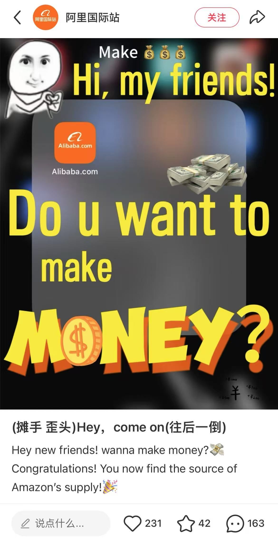 还有不少跨境电商直接注册小红书账号,发布英文带货视频。值得一提的是,阿里国际站官方也下场加入招揽客户,直接在帖文中用简单粗暴的“Do you want to make money(你想赚钱吗)?”这句话喊话。