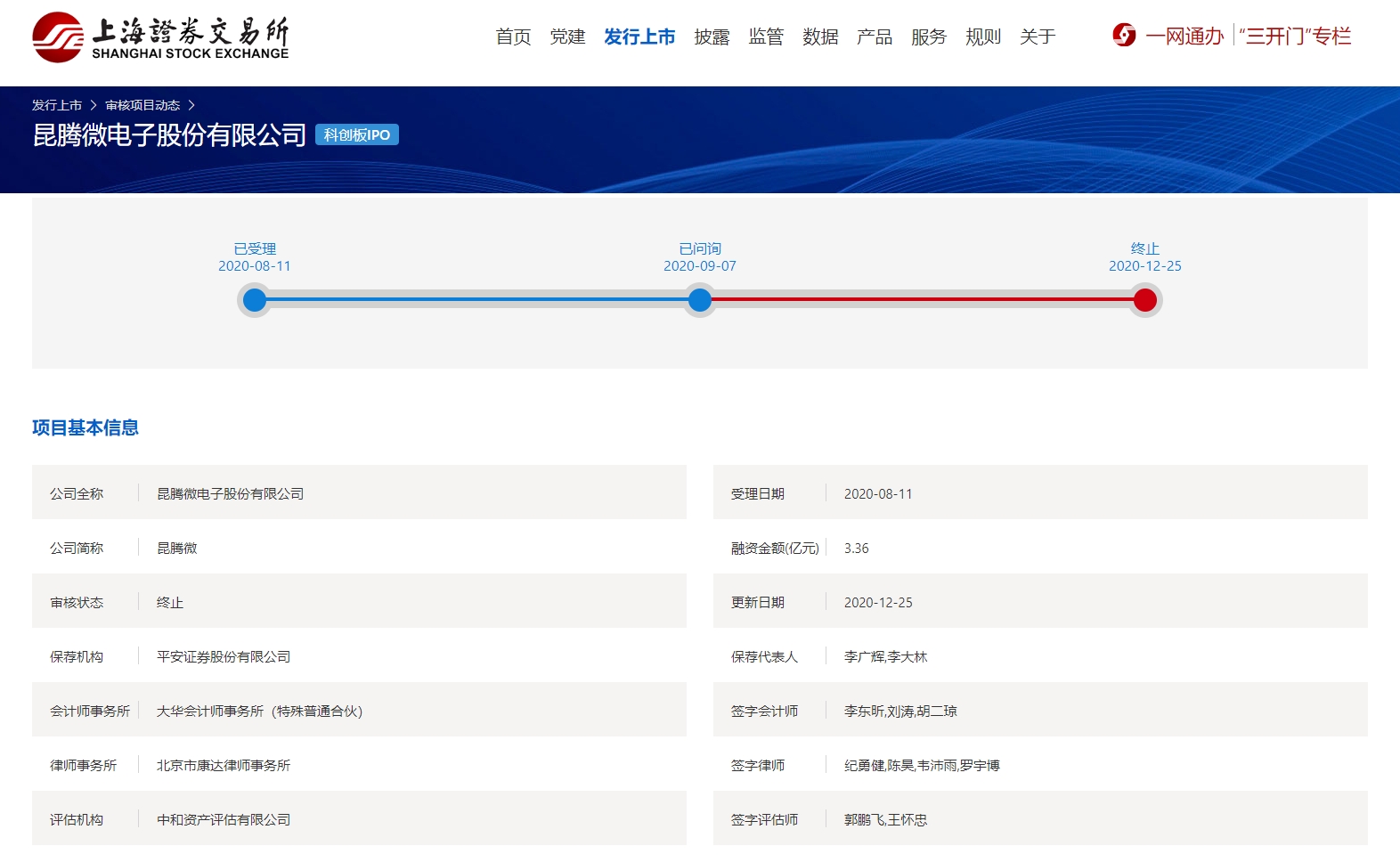 上交所官网显示,2020年8月11日,上交所受理了昆腾微的IPO申请,当年9月对其进行第一轮问询。2020年12月,因昆腾微与平安证券撤回发行上市申请,上交所终止对其进行发行上市审核。