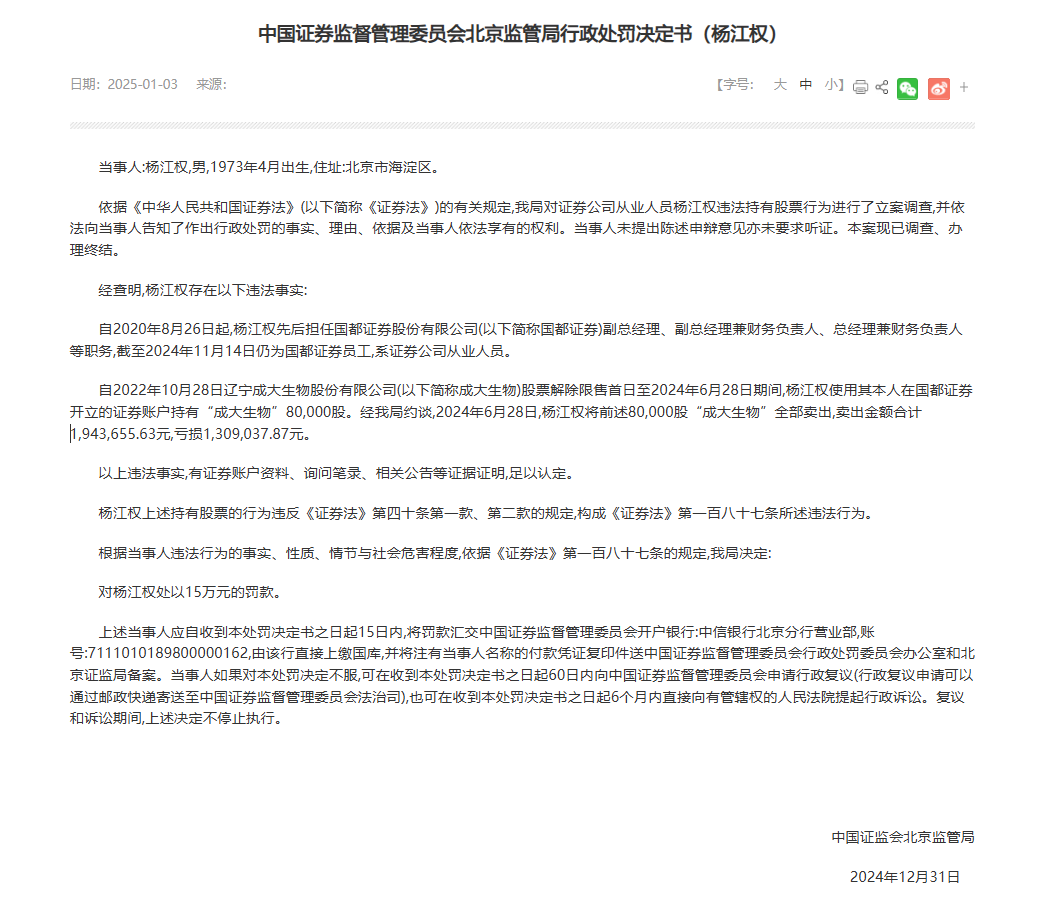 2025年1月3日,北京证监局披露的一份针对杨江权的行政处罚决定书显示,自2022年10月28日辽宁成大生物股份有限公司股票解除限售首日至2024年6月28日期间,杨江权使用其本人在国都证券开立的证券账户持有“成大生物”8万股。经北京证监局约谈,2024年6月28日,杨江权将前述8万股“成大生物”全部卖出,卖出金额合计194.37万元,亏损130.90万元。