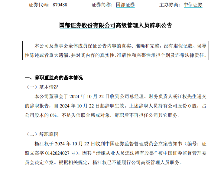 2024年10月23日晚,国都证券公告称收到时任总经理、财务负责人杨江权的辞职报告。公告显示,杨江权因“涉嫌从业人员违法持有股票”被中国证监会决定立案,并于2024年10月22日收到中国证监会立案告知书。