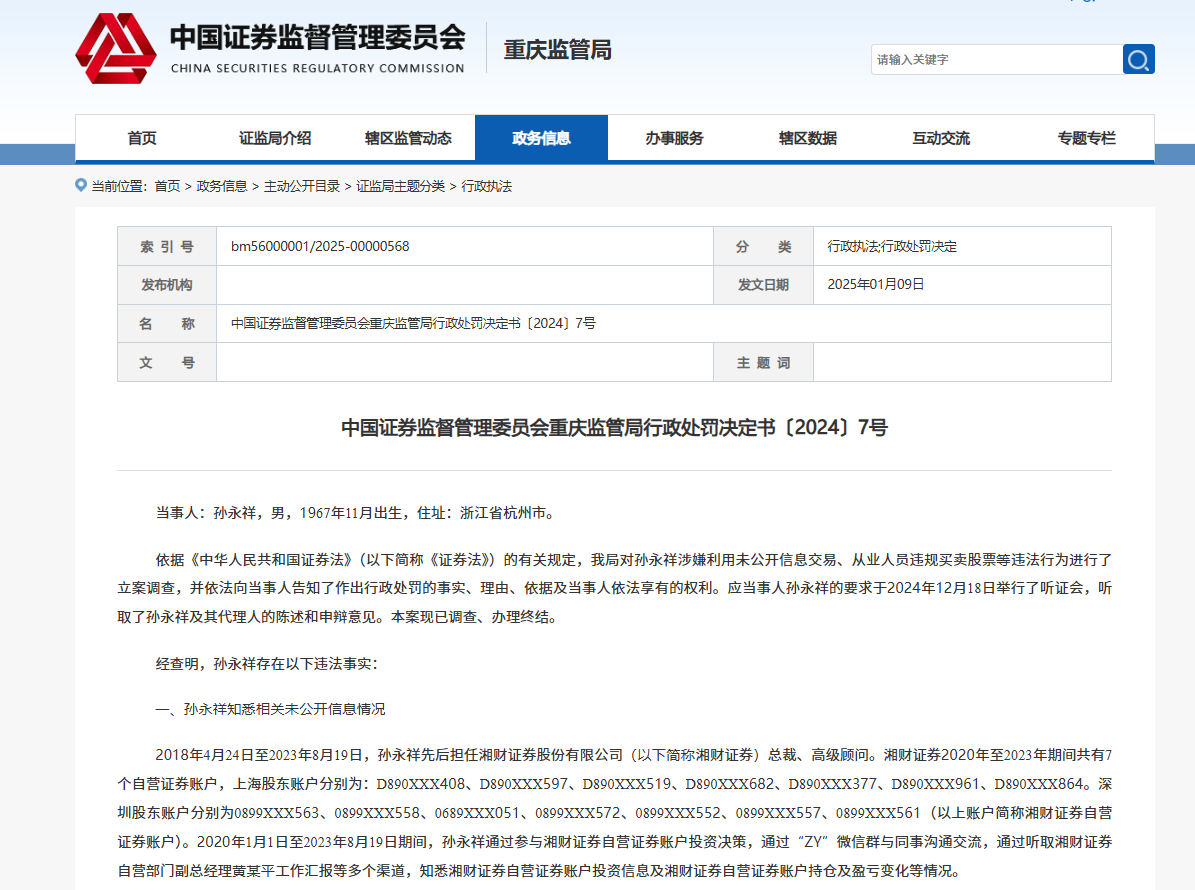 湘财证券前总裁因“老鼠仓”被罚没1842.29万元。