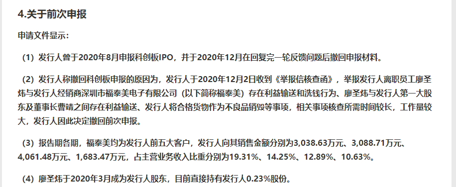 根据昆腾微对深交所首轮问询函的回复,其2020年撤回IPO的原因为“发行人(即昆腾微)于2020年12月2日收到《举报信核查函》,举报发行人离职员工廖圣炜与发行人经销商深圳市福泰美电子有限公司存在利益输送和洗钱行为、廖圣炜与发行人第一大股东及董事长曹靖之间存在利益输送、发行人将合格货物作为不良品销毁等事项,相关事项核查所需时间较长,工作量较大,发行人因此决定撤回前次申报。”