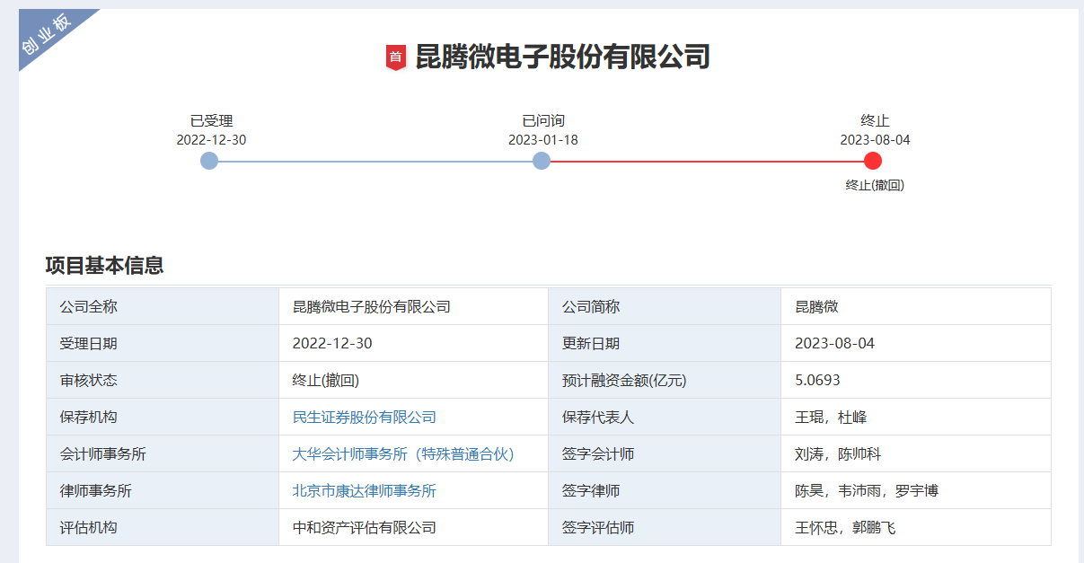 深交所官网显示,2022年,昆腾微改道冲击创业板IPO,保荐机构也变为民生证券。但2023年8月,同样在首轮问询后,昆腾微主动撤回IPO申请。