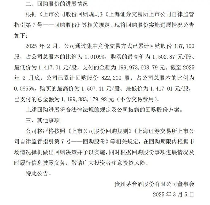 3月4日,贵州茅台发布公告显示,截至2025年2月底,贵州茅台已累计回购股份822,200股,占公司总股本的比例为0.0655%,购买的最高价为1,507.41元/股、最低价为1,417.01元/股,已支付的总金额为1,199,883,179.92元(不含交易费用)。