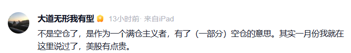 此外,3月10日,美股暴跌后,知名投资者段永平(雪球ID:大道无形我有型)在雪球上表示,“终于来了!很少享受到空仓的快感,投资以来第一次。”段永平表示自己是一个满仓主义者,但最近有了一部分空仓,他同时表示,早在一月份就说过了,美股有点贵。