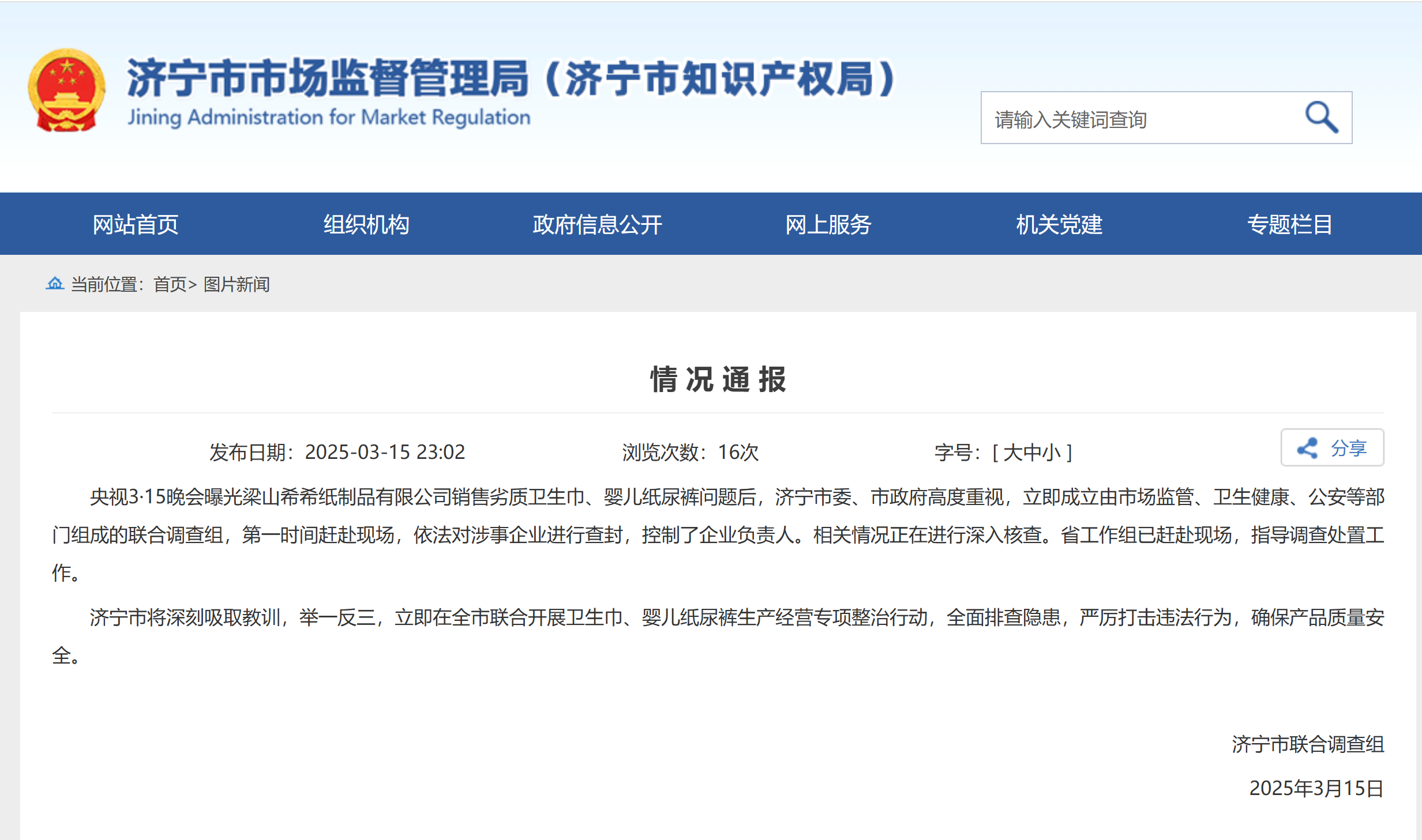 3月15日晚间,据济宁市联合调查组,央视3·15晚会曝光梁山希希纸制品有限公司销售劣质卫生巾、婴儿纸尿裤问题后,济宁市委、市政府高度重视,立即成立由市场监管、卫生健康、公安等部门组成的联合调查组,第一时间赶赴现场,依法对涉事企业进行查封,控制了企业负责人。相关情况正在进行深入核查。省工作组已赶赴现场,指导调查处置工作。