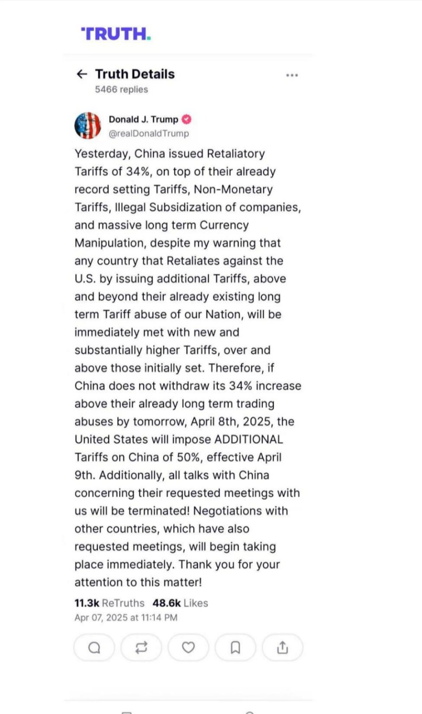 当地时间4月7日盘中,特朗普扬言要对中国的关税反制措施进行报复。