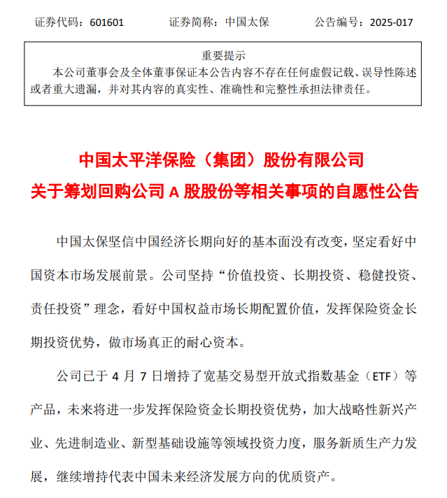中国太平洋保险(集团)股份有限公司4月8日表示,作为综合性保险集团,中国太保(601601.SH)坚信中国经济长期向好的基本面没有改变,坚定看好中国资本市场发展前景。中国太保将坚持长期投资、价值投资、稳健投资,发挥保险资金长期投资优势,做市场真正的耐心资本,加大战略性新兴产业、先进制造业、新型基础设施等领域投资力度,服务新质生产力发展,为维护市场稳定运行贡献力量。