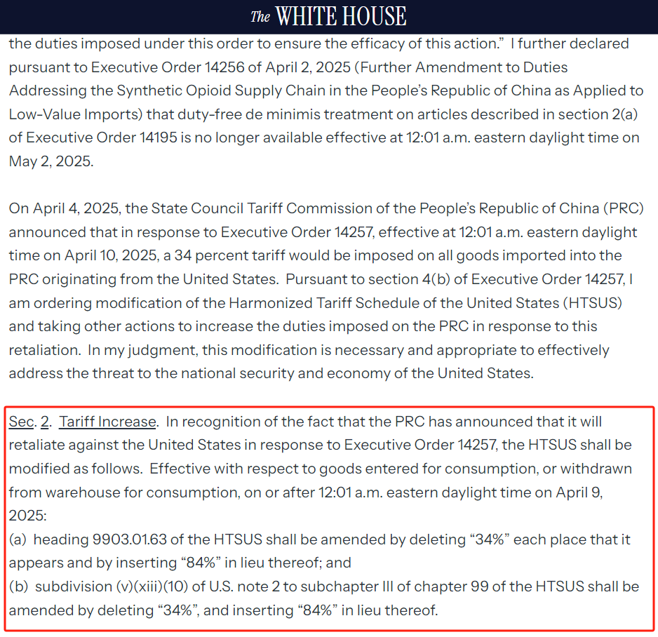 当地时间4月8日,美国白宫官网发布的特朗普总统令《对适用于从中华人民共和国进口的低价值商品的互惠关税和更新关税的修正案》,其中提到:美国现对《美国统一关税表》(HTSUS)作出如下修改。自2025年4月9日东部夏令时间凌晨12:01起,对之后入关供消费或出仓供消费的货物生效:(a)应修改《美国统一关税表》第9903.01.63类目,删除所有出现的“34%”,并替换为“84%”;以及(b)《美国统一关税表》第99章第三分章第(v)(xiii)(10)项的注释2的子目应进行修改,删除“34%”,并插入“84%”以替代。