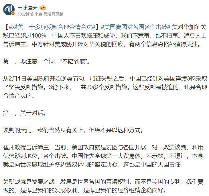 4月9日,@玉渊谭天发文,美对华加征关税已经超过100%。中国人不喜欢施压和威胁,我们不惹事,也不怕事。消息人士表示,中方针对美威胁升级对华关税的回应,有两个信息点格外值得关注。