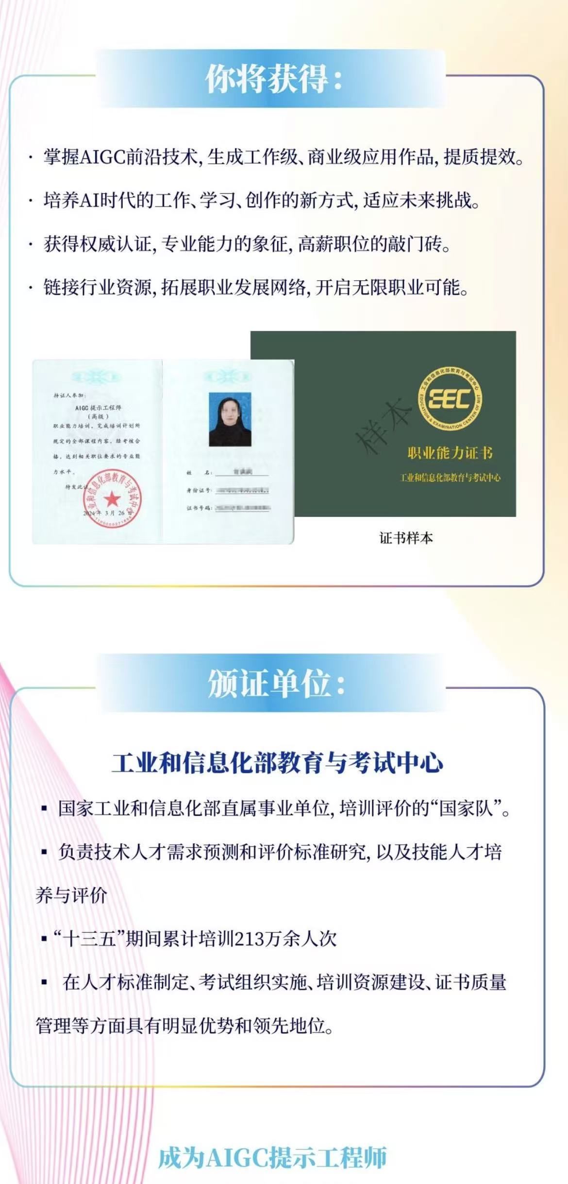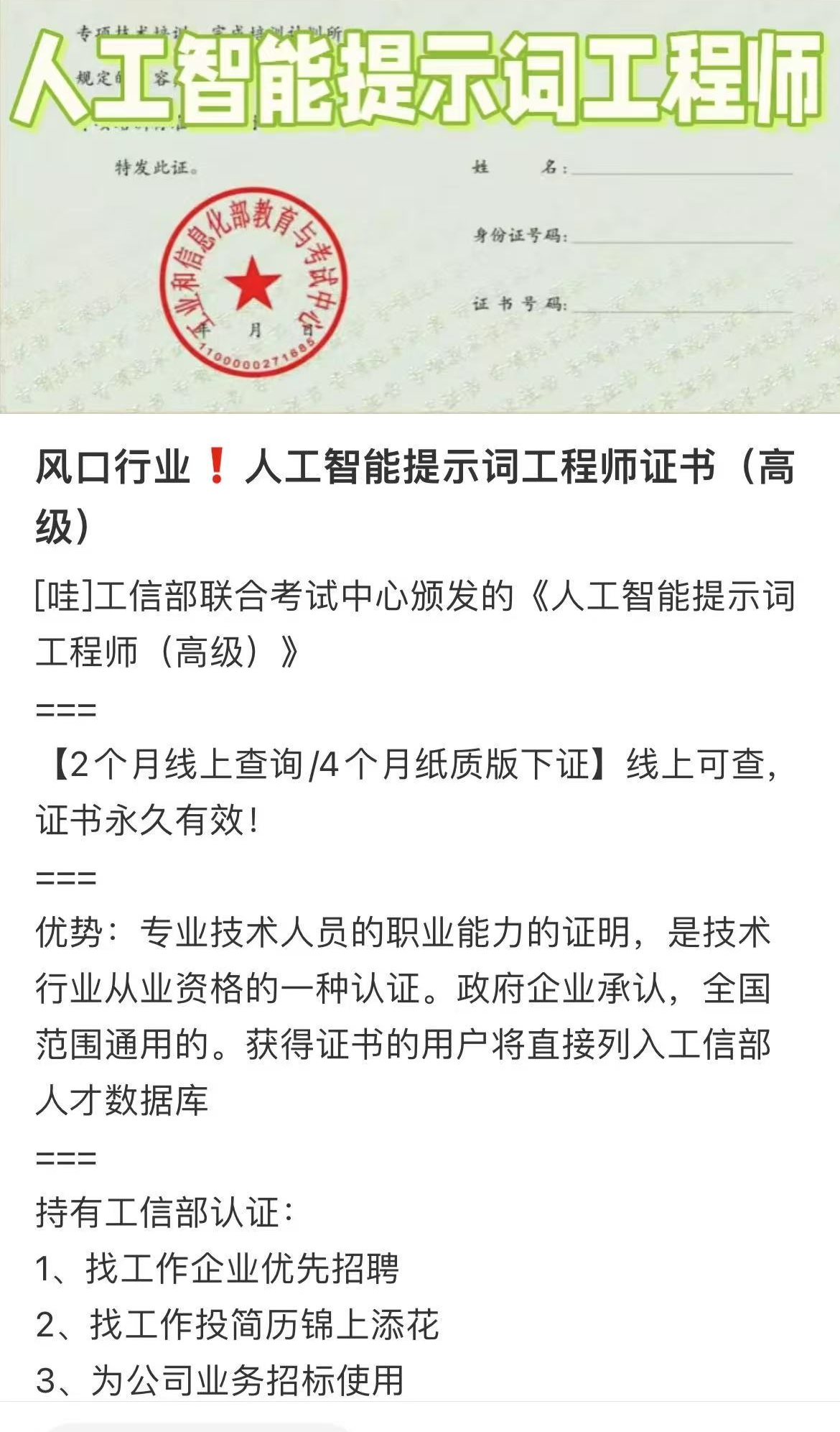 综合社交平台上关于“AI提示词工程师”考证帖文,报考“AI提示词工程师”证书对专业没有限制,零基础小白也能参与。这些帖文还声称,“通过测试后还能拿到中国电子学会或工信部下属单位颁发的证书,含金量高。”