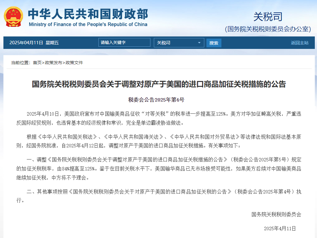 一、调整《国务院关税税则委员会关于调整对原产于美国的进口商品加征关税措施的公告》(税委会公告2025年第5号)规定的加征关税税率,由84%提高至125%。鉴于在目前关税水平下,美国输华商品已无市场接受可能性,如果美方后续对中国输美商品继续加征关税,中方将不予理会。