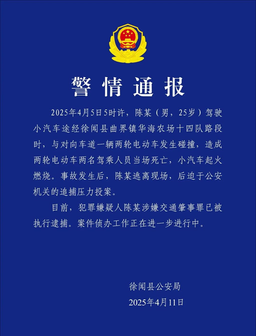 4月11日,广东徐闻县公安局发布警情通报称,4月5日5时许,25岁的陈某驾驶小汽车途经徐闻县曲界镇华海农场十四队路段时,与对向车道一辆两轮电动车发生碰撞,造成两轮电动车两名驾乘人员当场死亡,小汽车起火燃烧。事故发生后,陈某逃离现场,后迫于公安机关的追捕压力投案。