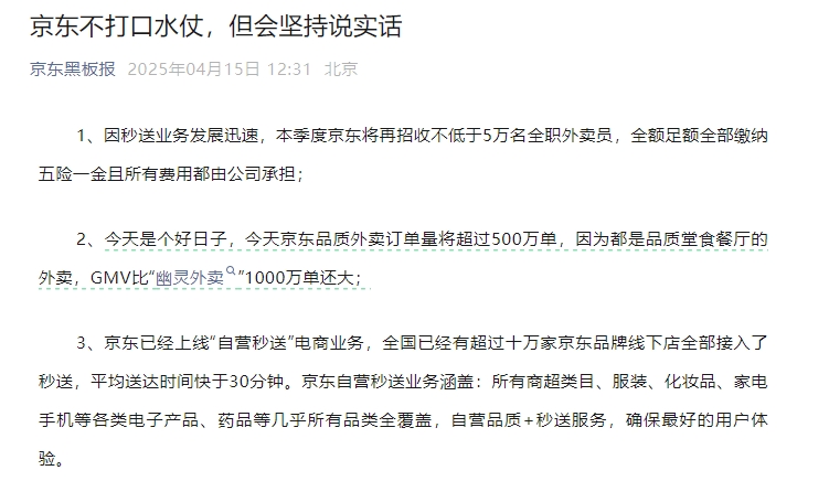 京东发文称“不打口水仗”,本季度将再招至少5万名全职外卖员
