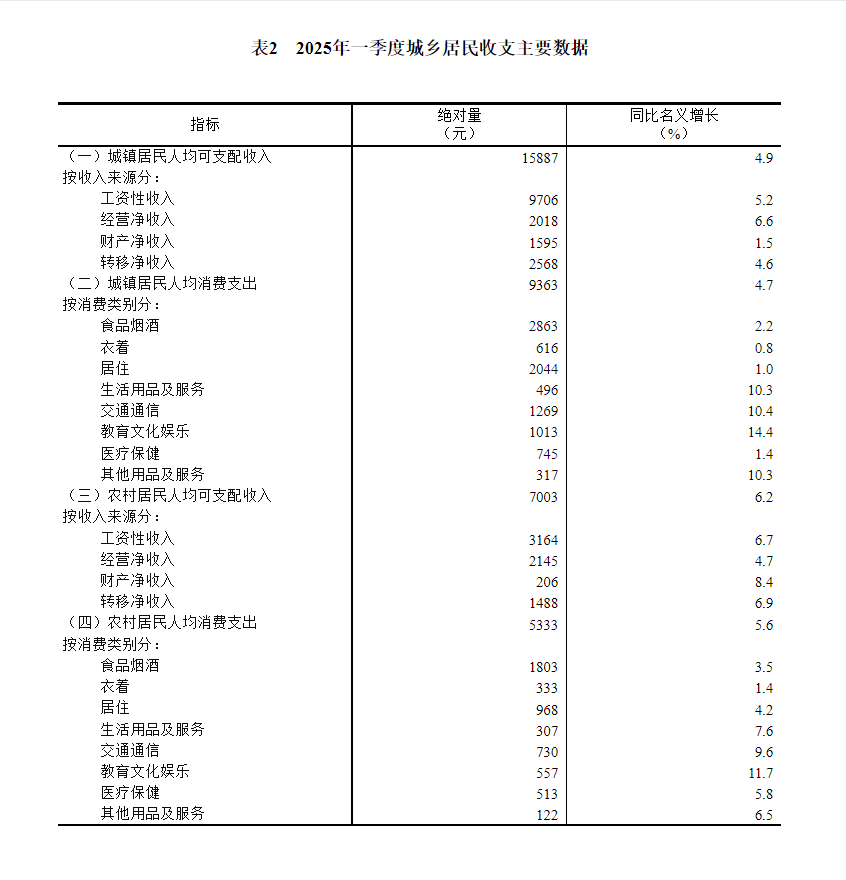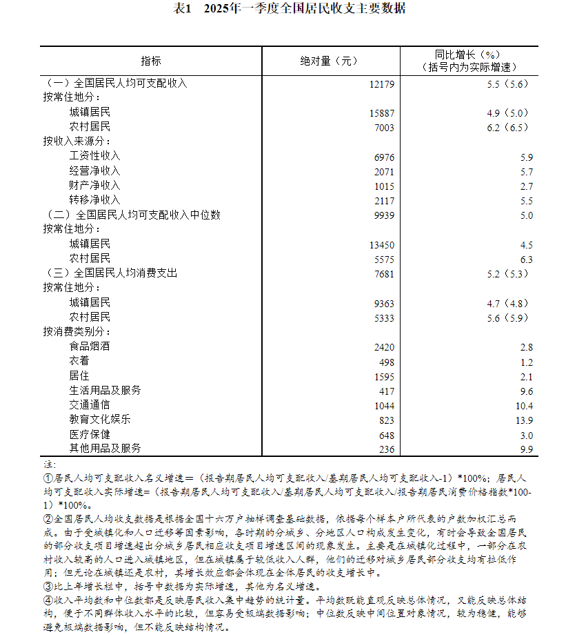 4月16日,国家统计局发布2025年一季度居民收入和消费支出情况。具体如下: