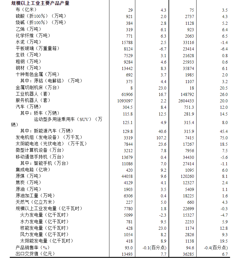分产品看,3月份,规模以上工业623种产品中有405种产品产量同比增长。其中,钢材13442万吨,同比增长8.3%;水泥15788万吨,增长2.5%;十种有色金属692万吨,增长3.7%;乙烯319万吨,增长6.1%;汽车304.5万辆,增长8.4%,其中新能源汽车129.8万辆,增长40.6%;发电量7780亿千瓦时,增长1.8%;原油加工量6306万吨,增长0.4%。