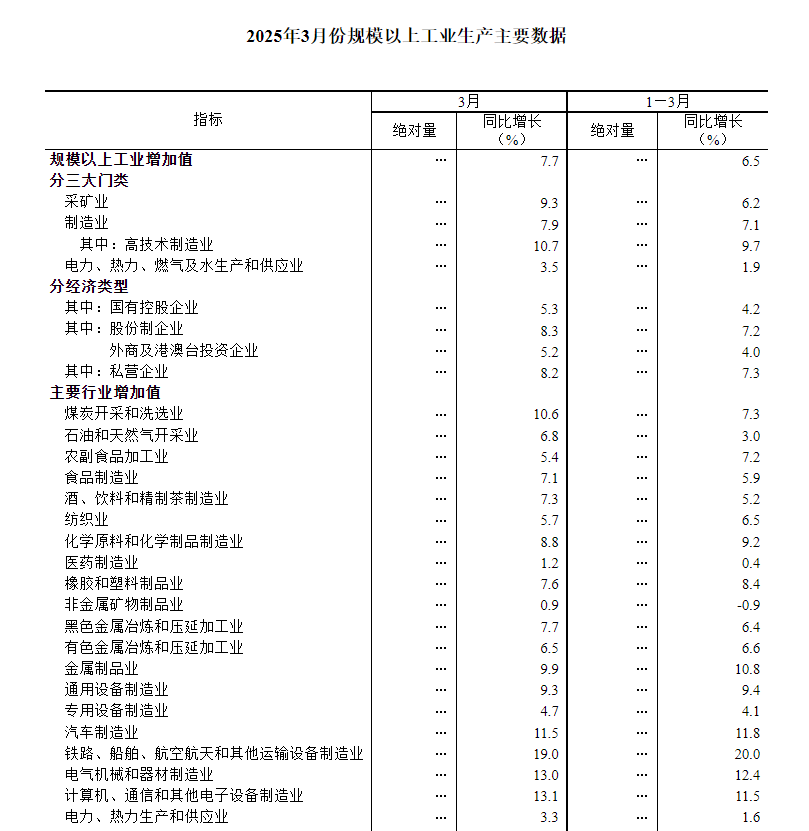国家统计局:2025年3月份规模以上工业增加值增长7.7%
