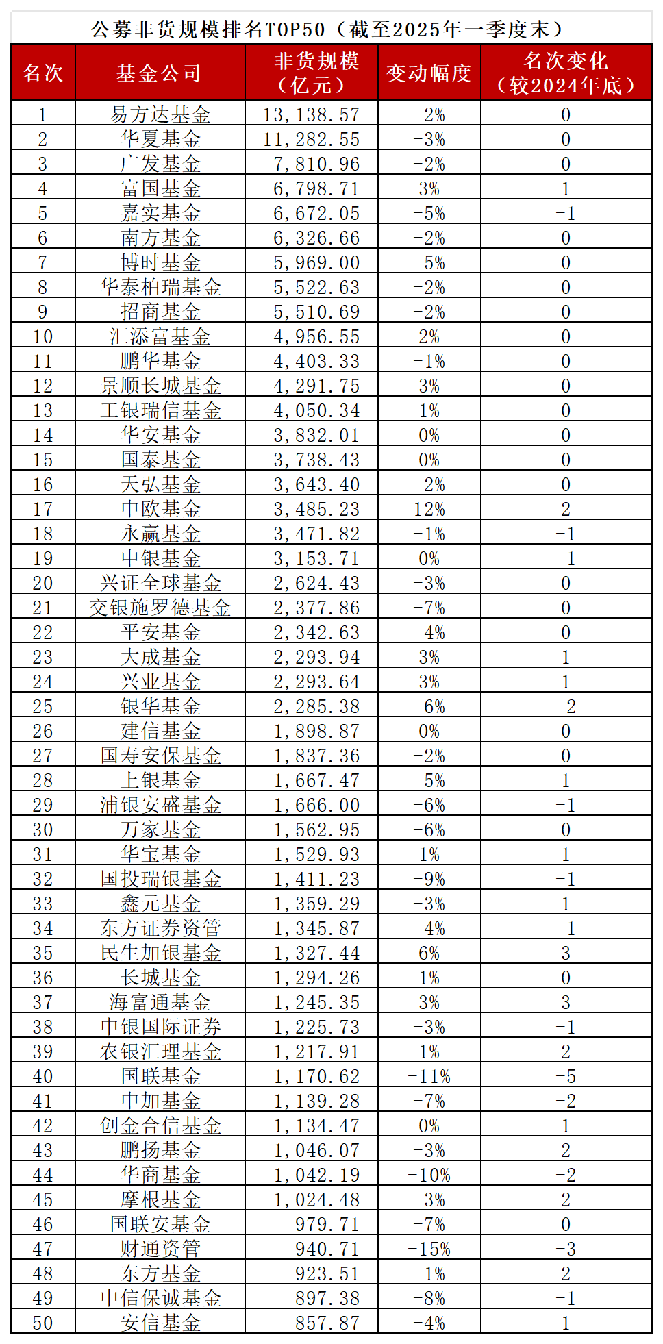 据Wind数据统计,截至一季度末,公募非货规模前10名名单较2024年底不变,10家公募非货规模合计7.4万亿元,占持牌公募机构非货总规模比例近四成。