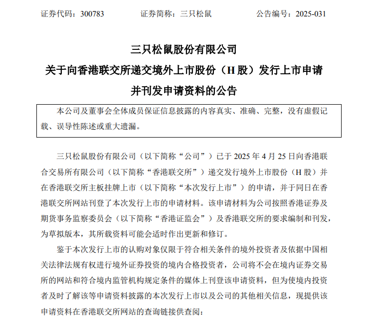 4月28日,三只松鼠(300783.SZ)公告称,公司已于2025年4月25日向香港联合交易所有限公司递交发行境外上市股份(H股)并在香港联交所主板挂牌上市的申请,并于同日在香港联交所网站刊登了本次发行上市的申请材料。该申请材料为草拟版本,其所载资料可能会适时作出更新和修订。公司本次发行上市尚需取得相关政府机关、监管机构、证券交易所的批准、核准或备案,该事项仍存在不确定性。