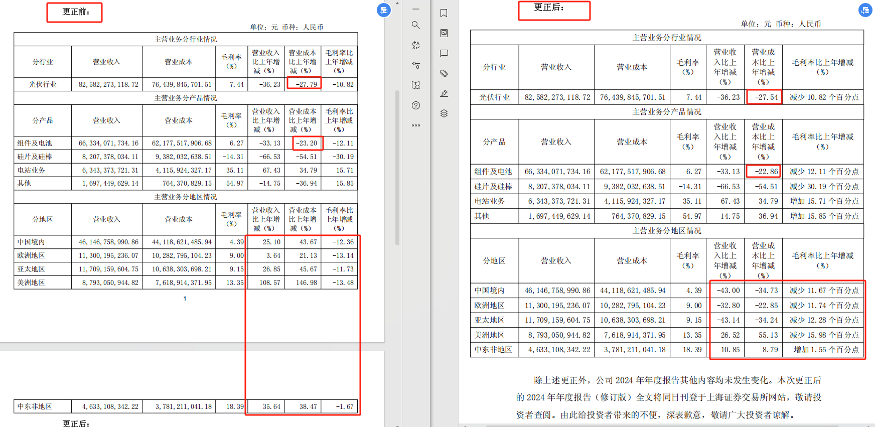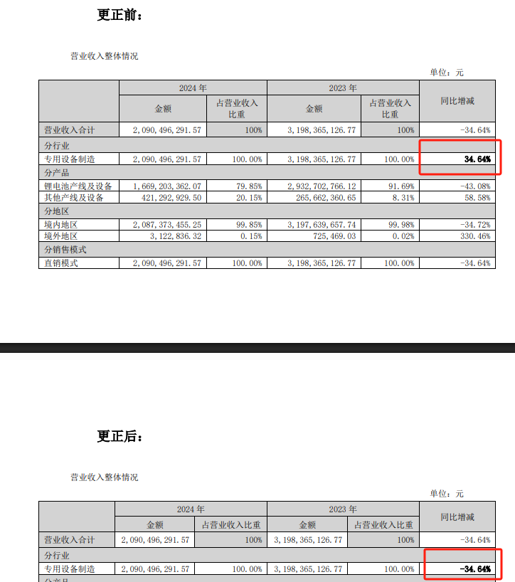 24家公司中,市值最大的是隆基绿能(601012.SH)。在4月29日晚发布2024年报后,隆基绿能于5月6日晚发布《更正公告》称,经自查,2024年年度报告全文“第三节五、(一)2、(1).主营业务分行业、分产品、分地区、分销售模式情况”表格中,同比变动部分数据披露有误。