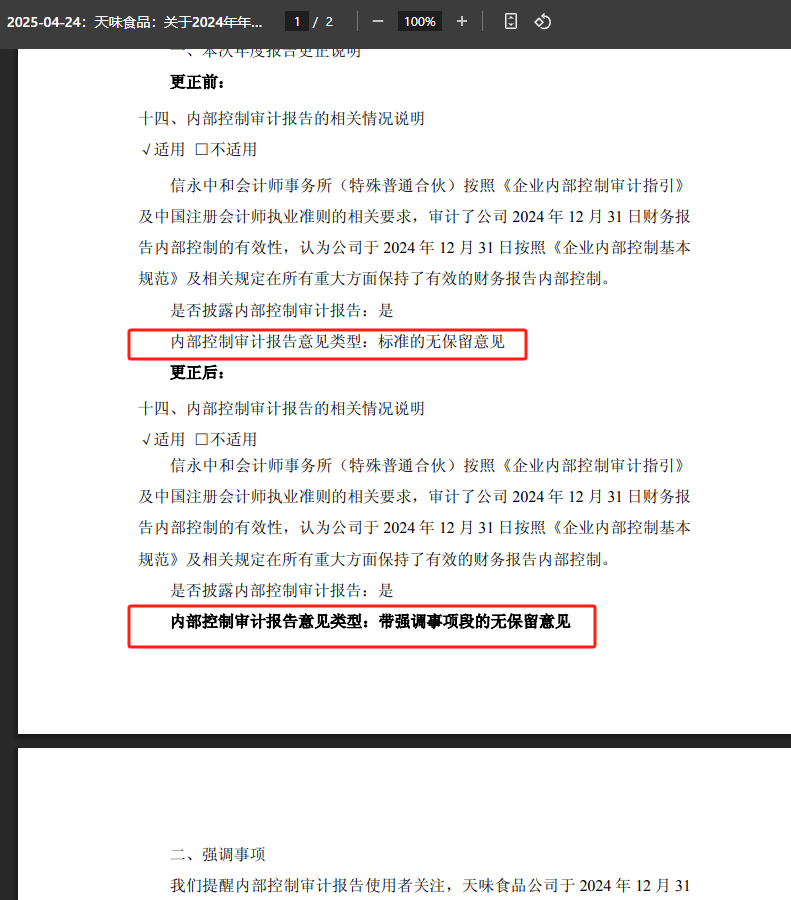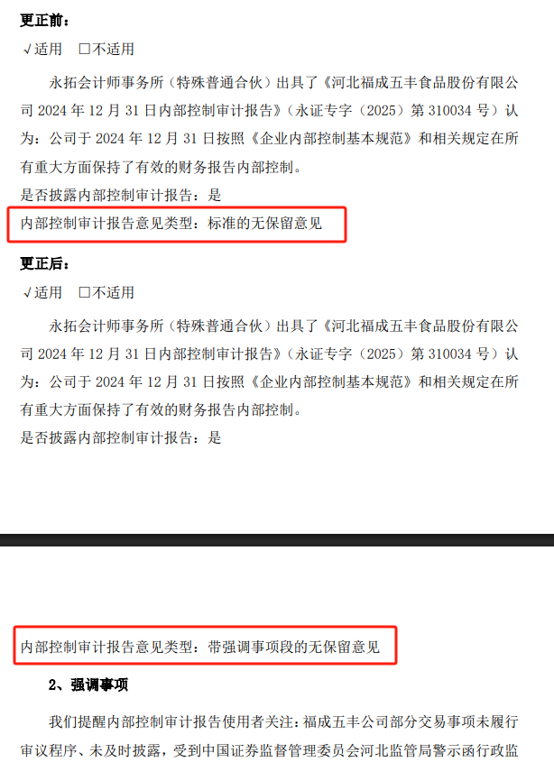 福成股份的情况和天味食品类似,也对内部控制审计报告意见类型进行了更正,由“标准的无保留意见”更正为“带强调事项段的无保留意见”,并补充了强调事项内容。